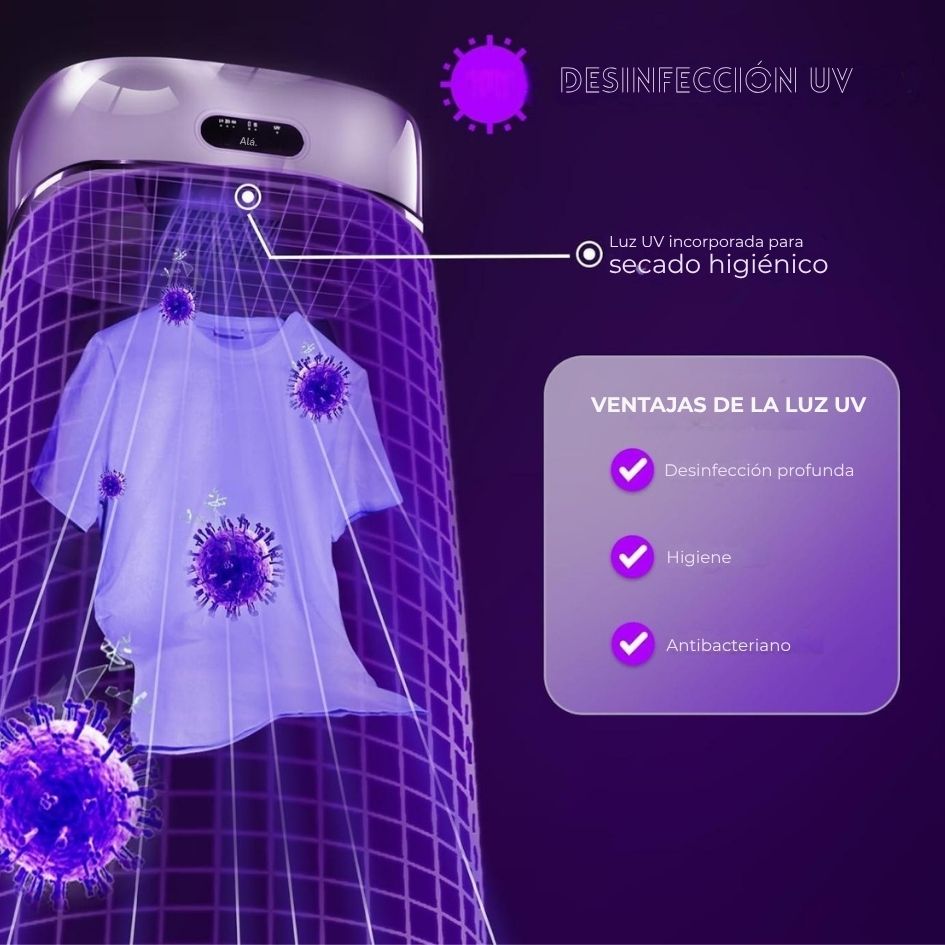 Compacta, potente y silenciosa, combina flujo de aire 3D de 360°, temperatura constante de 60 °C y luz UV para secar, desinfectar y proteger tus prendas como nunca antes.